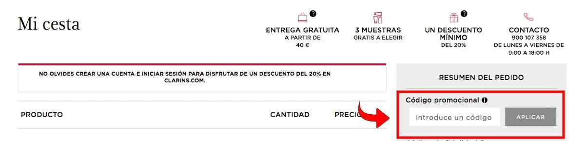 4.- Después, tendrás que ir a tu cesta de la compra en Clarins. Allí podrás encontrar una zona donde indica “Código Promocional” (lo hemos resaltado en rojo en la imagen de abajo) lugar en el que tendrás que pegar tu código previamente copiado y aplicarlo.