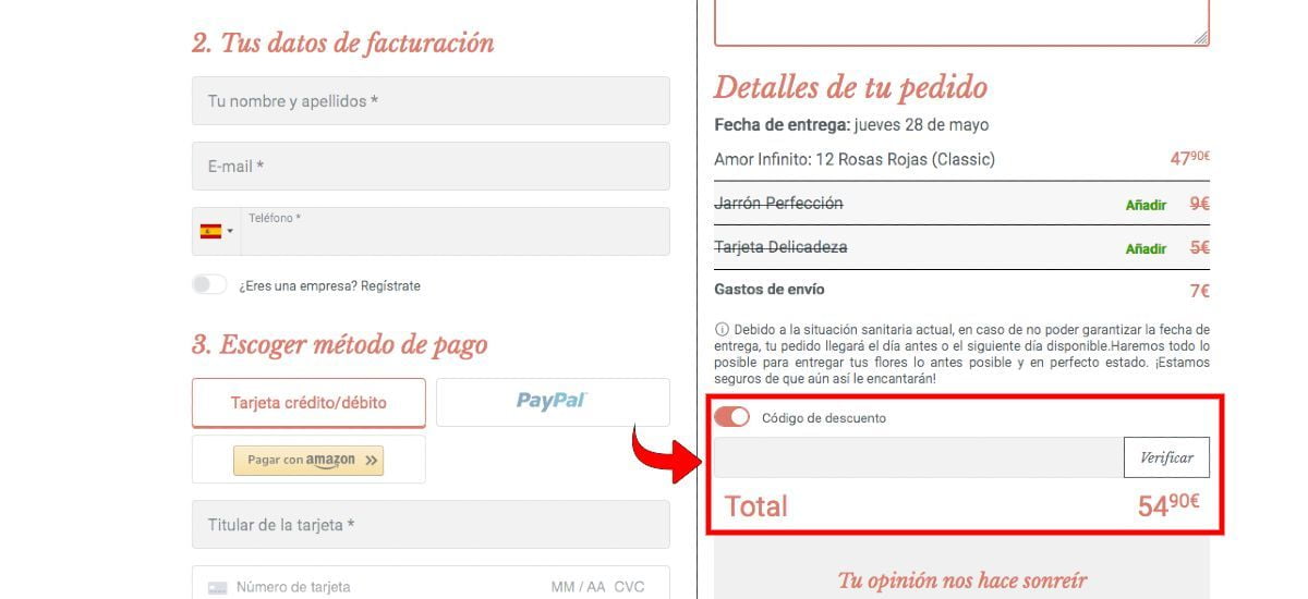 4.- Después, tendrás que configurar tu pedido: dedicatoria, ver si quieres añadir algún extra como un jarrón, un osito, etc…. Una vez te encuentres en el paso anterior a pagar verás una zona que indica «Código Descuento» (lo hemos resaltado en rojo en la imagen de abajo). Allí tendrás que activarlo y se te desplegará un cajetín para que puedas pegar tu cupón Floraqueen y pulsar en «Verificar».
